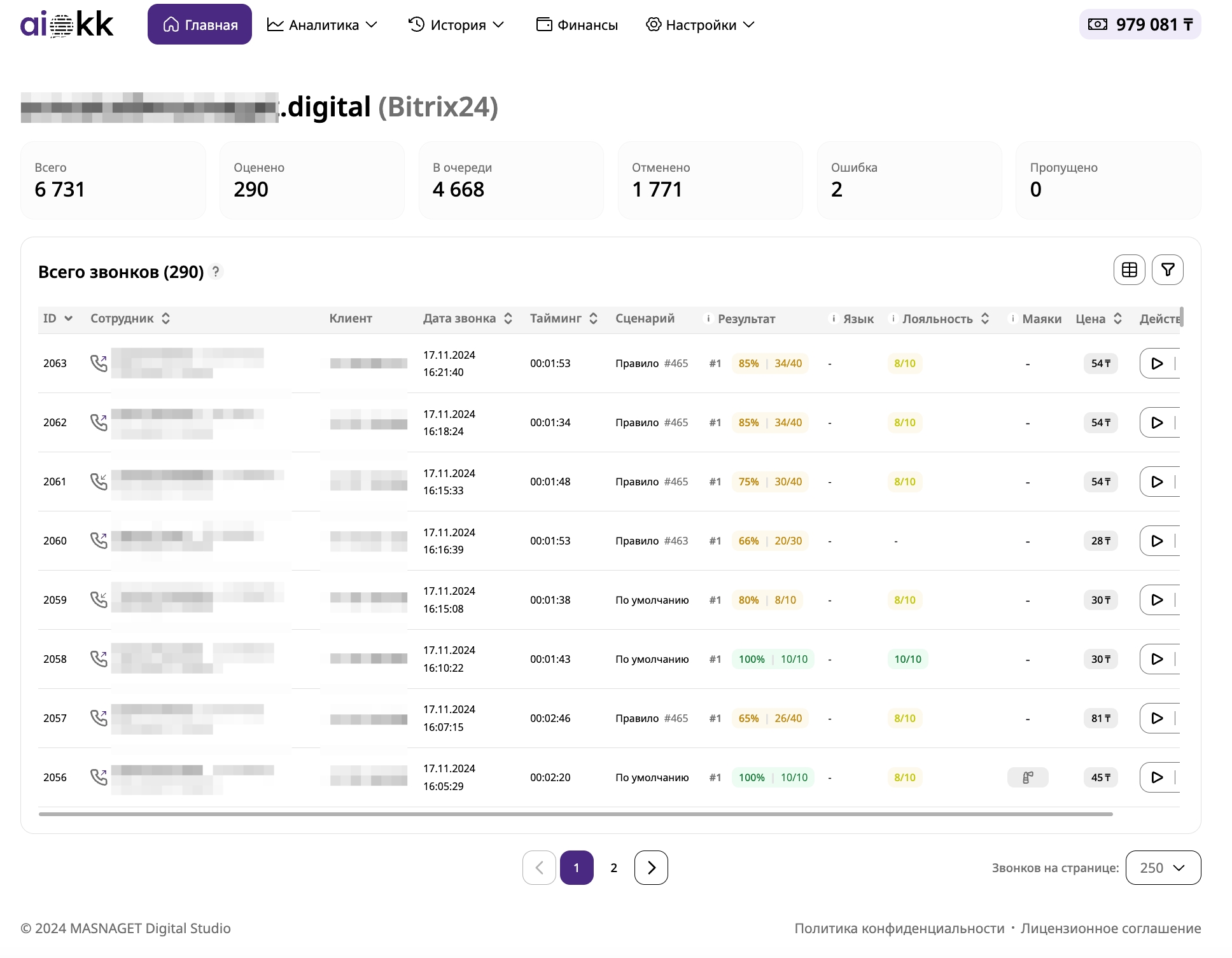 Общая стоимость аналитики, выполненной по данному разговору, отображается в выбранной валюте аккаунта. Например, если разговор участвовал в переоценке, итоговая стоимость аналитики будет включать все понесенные затраты за все оценки.