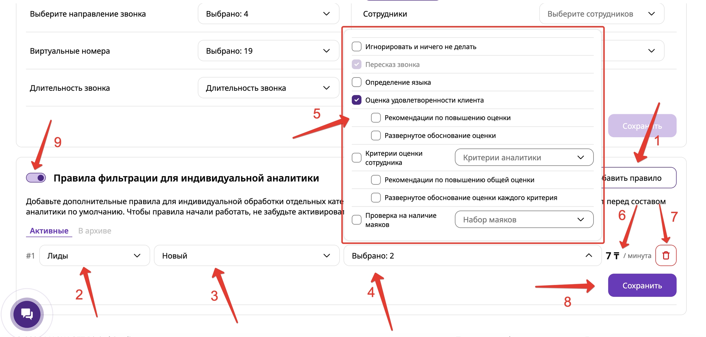 В зависимости от активированных задач, стоимость минуты проанализированного разговора будет автоматически пересчитываться.