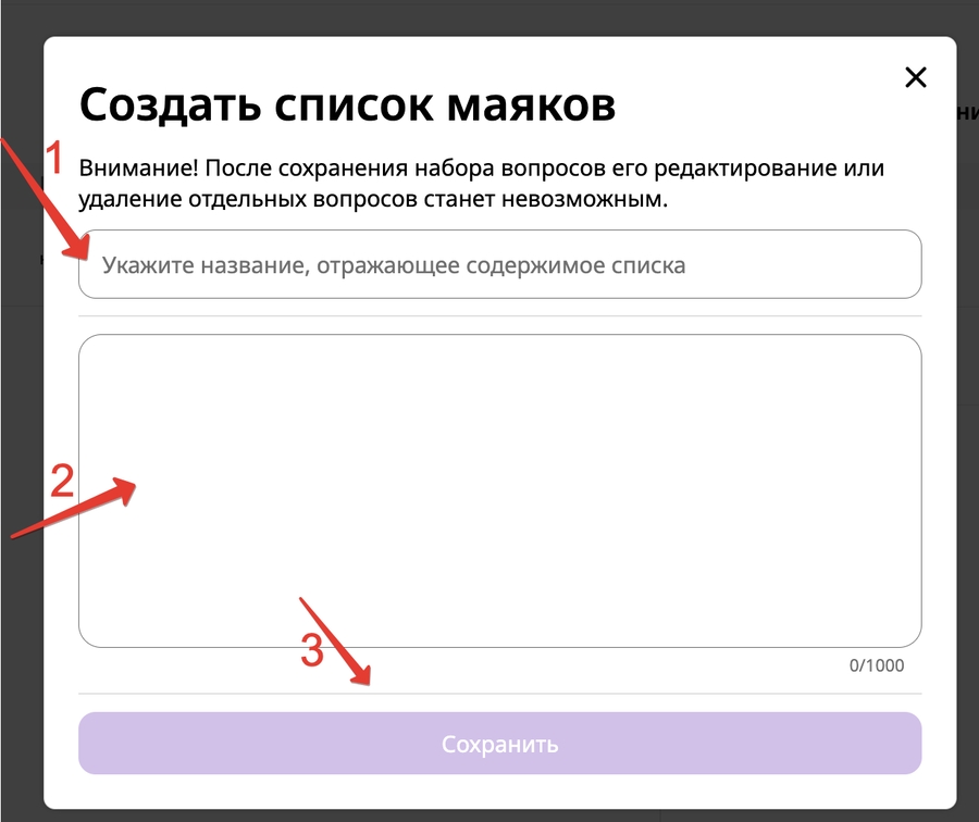 Введите название будущего списка маяков. Рекомендуем указывать "говорящее" название, отражающее суть указываемых в нем ключевых слов и фраз, и выделяющее его на фоне остальных списков. Например "