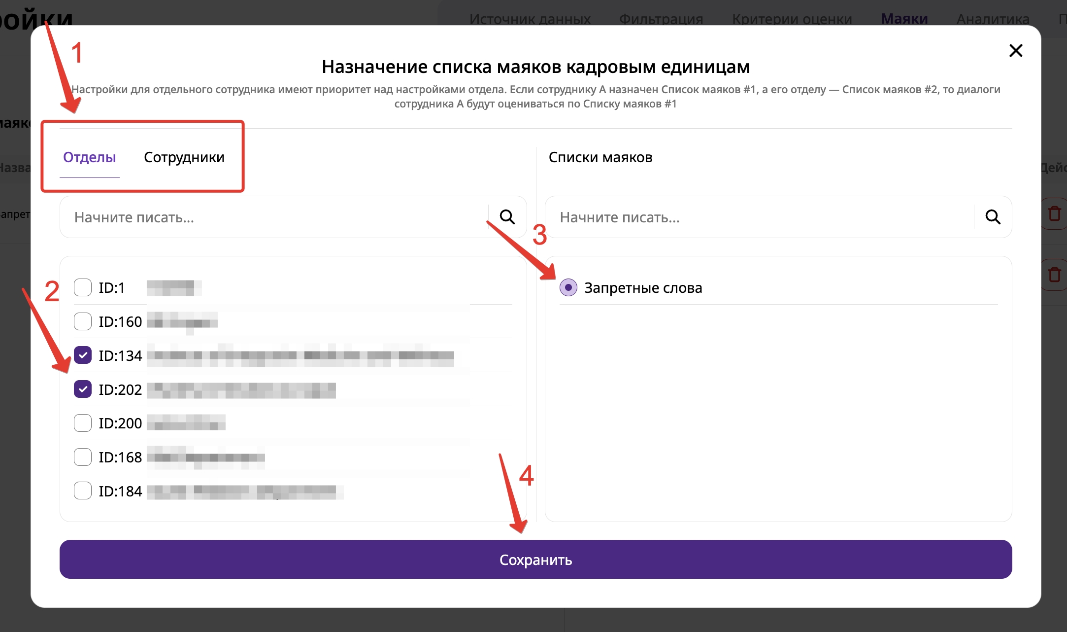 - В левой части открывшегося окна выберите необходимые отделы или сотрудников, а в правой части выберите нужный список маяков. Сохраните выбор, нажав кнопку "Присвоить".
